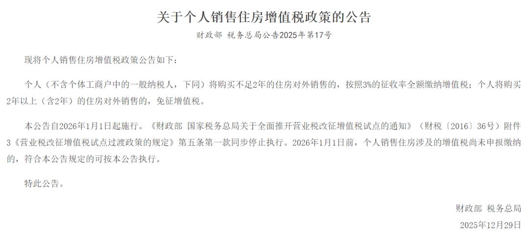 2025年12月30日,财政部、税务总局发布《关于个人销售住房增值税政策的公告》。公告提出,自2026年1月1日起,个人将购买2年以上(含2年)的住房对外销售的,免征增值税;个人将购买不足2年的住房对外销售的,增值税征收率从5%下调到3%。