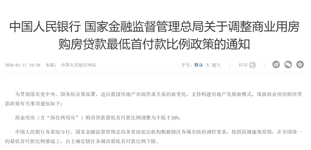 根据央行、金融监管总局发布的《关于调整商业用房购房贷款最低首付款比例政策的通知》,将商业用房购房贷款最低首付比例下调至30%,支持推动商办房地产市场去库存。