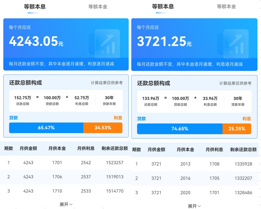 贴息之前,商贷利率3.05%,每月还款金额4243元,30年利息总额52.75万元。