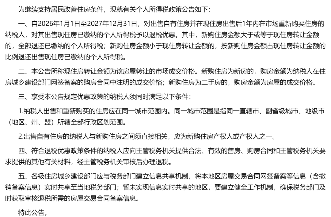 为继续支持居民改善住房条件,财政部、税务总局、住房城乡建设部发布《关于延续实施支持居民换购住房有关个人所得税政策的公告》,明确自2026年1月1日至2027年12月31日,对出售自有住房并在现住房出售后1年内在市场重新购买住房的纳税人,对其出售现住房已缴纳的个人所得税予以退税优惠。